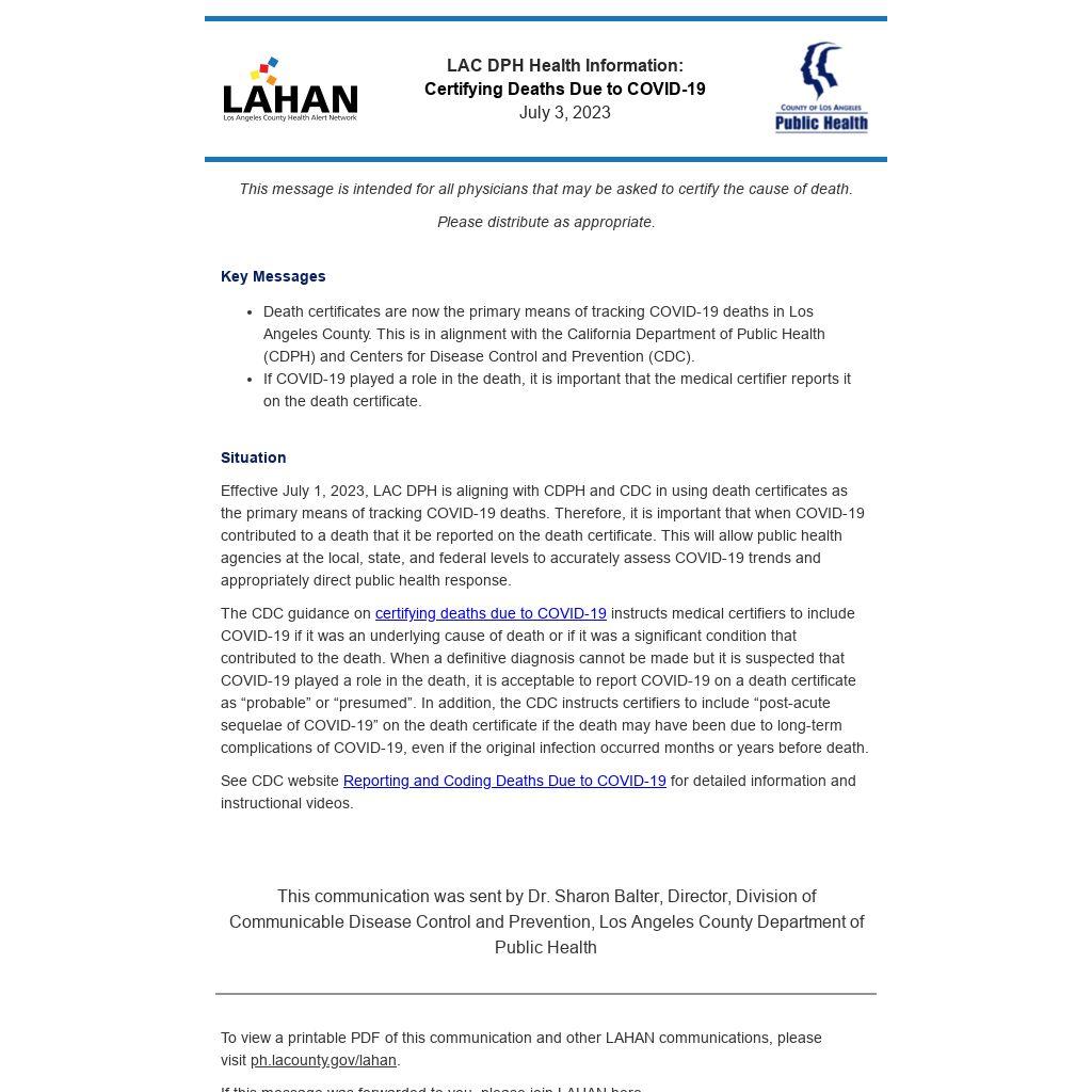 Effective July 1, 2023, LAC DPH is aligning with CDPH and CDC in using death certificates as the primary means of tracking COVID-19 deaths. Therefore, it is important that when COVID-19 contributed to a death that it be reported on the death certificate. This will allow public health agencies at the local, state, and federal levels to accurately assess COVID-19 trends and appropriately direct public health response.