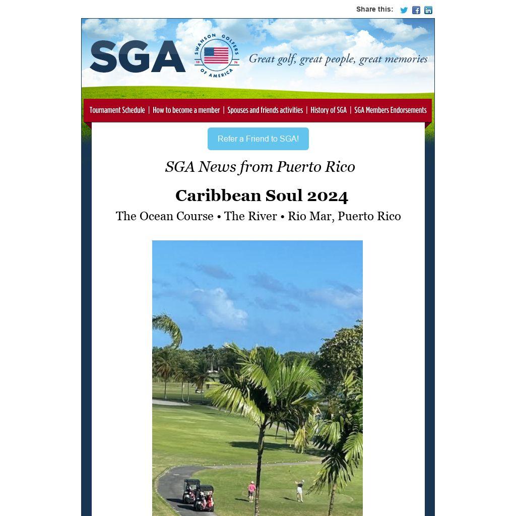 The SGA event began with an interesting tour of El Yunque rainforest and welcoming drinks on the outdoor terrace at the Rio Mar Wyndham, overlooking the blue Atlantic and adjacent to the area's golden beaches. SGA Hall of Fame members Mary Ann Calvert, Jeff Leech, Janie Risley, Walt Schroeder, and Bill Suehs were recognized and details were given for the week's events. A locally-influenced dinner followed in the resort's Roots Coastal Kitchen.