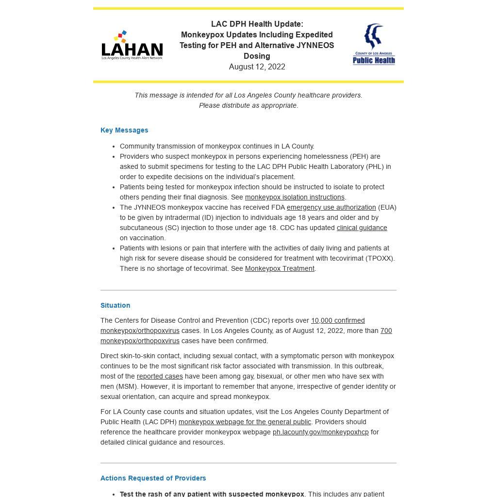 Providers who need clinical consultation or are requesting approval for monkeypox testing at our Public Health Laboratory can call: