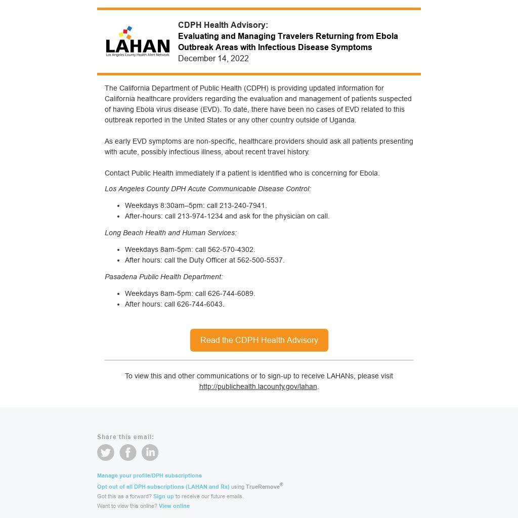 The California Department of Public Health (CDPH) is providing updated information for California healthcare providers regarding the evaluation and management of patients suspected of having Ebola virus disease (EVD). To date, there have been no cases of EVD related to this outbreak reported in the United States or any other country outside of Uganda.