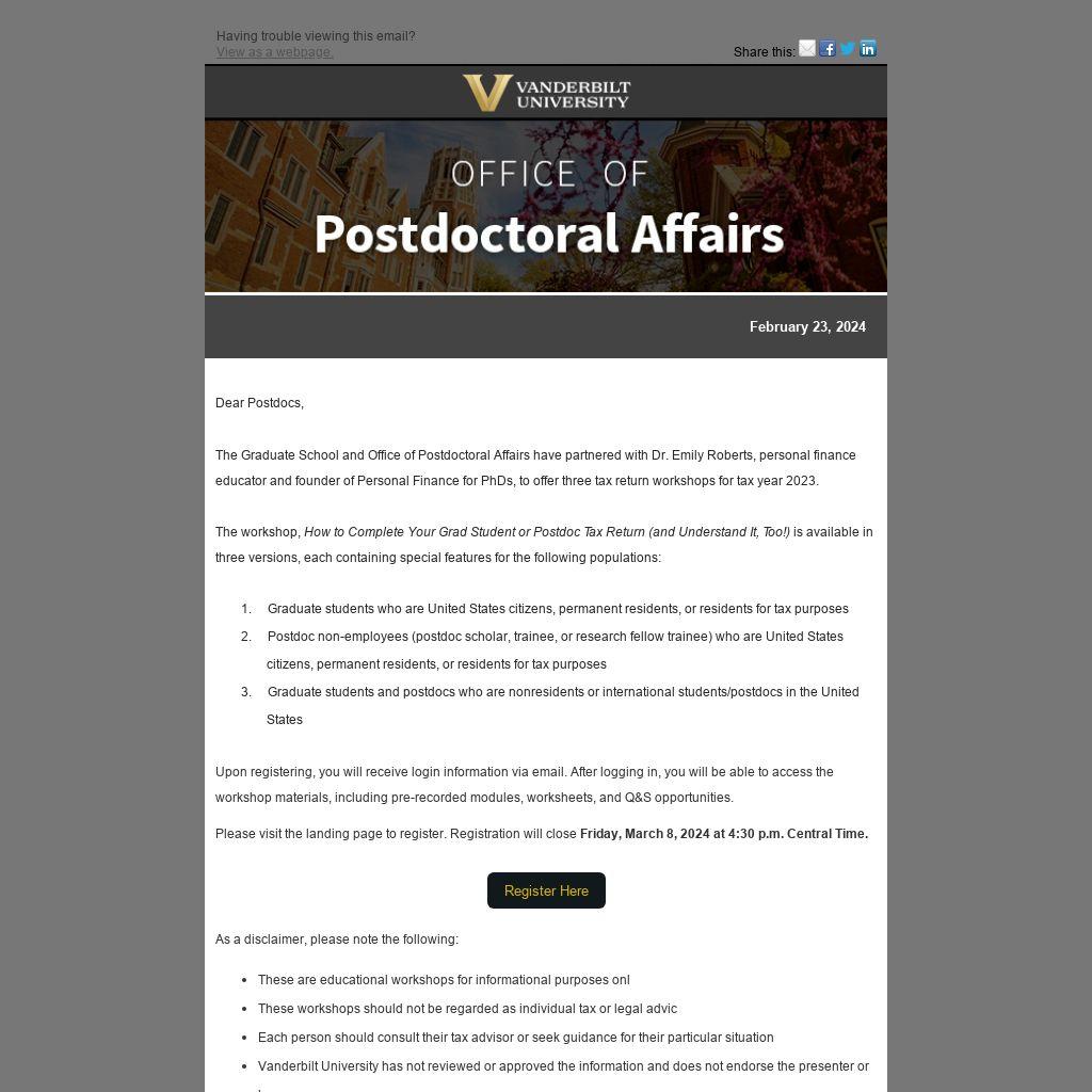The Graduate School and Office of Postdoctoral Affairs have partnered with Dr. Emily Roberts, personal finance educator and founder of Personal Finance for PhDs, to offer three tax return workshops for tax year 2023.