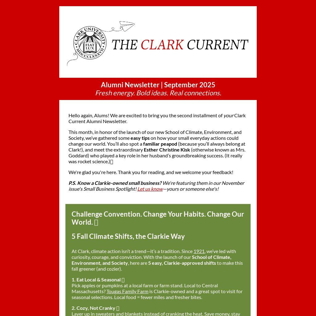 Weāre building something specialāall because of you. This is your newsletter: tell us what youād love to see, share your unique Clark story, and pass it along to other alums to help keep the Current moving forward.