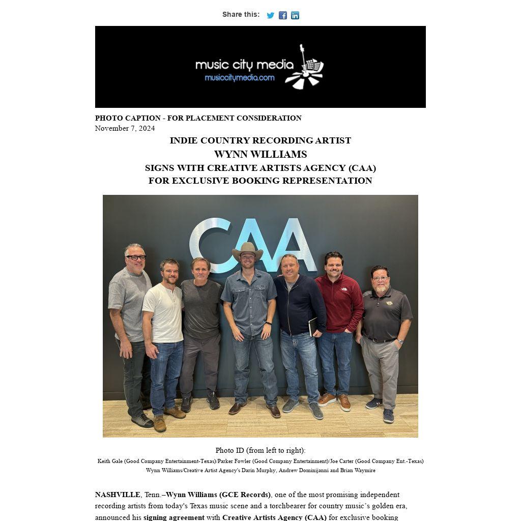 "Working with the CAA team is a dream come true. Our partnership will put me in front of fans old and new across the U.S. and the globe. We’re working on new music to roll out in a 2025 waterfall series leading to a new album; the opportunity will expand my reach to share the new music with a broader audience of country music fans,” said the Texan from Ft. Worth, Wynn Williams. “I’m excited to see what the future holds and appreciate the folks at CAA, and my management team at Good Company Entertainment, for believing in me.”