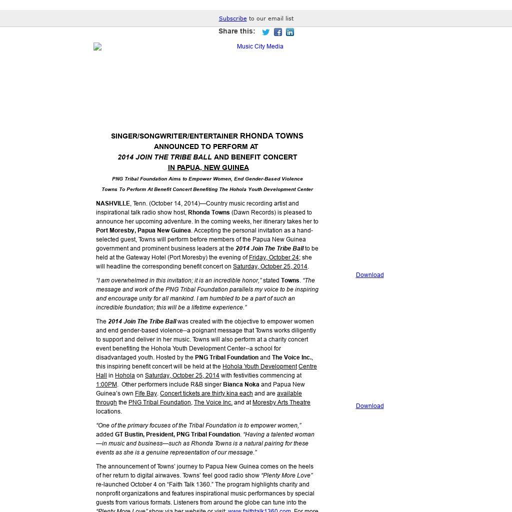 NASHVILLE, Tenn. (October 14, 2014)—Country music recording artist and inspirational talk radio show host, Rhonda Towns (Dawn Records) is pleased to announce her upcoming adventure. In the coming weeks, her itinerary takes her to Port Moresby, Papua New Guinea. Accepting the personal invitation as a hand-selected guest, Towns will perform before members of the Papua New Guinea government and prominent business leaders at the 2014 Join The Tribe Ball to be held at the Gateway Hotel (Port Moresby) the evening of Friday, October 24; she will headline the corresponding benefit concert on Saturday, October 25, 2014.