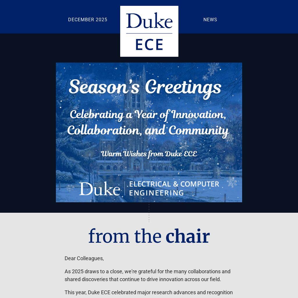 This year, Duke ECE celebrated major research advances and recognition across quantum computing, AI, semiconductors, metamaterials and more. Our faculty are developing quantum systems that promise to transform secure communications and computation, pioneering new approaches to edge computing that bring powerful AI to small, energy-efficient devices, and engineering metamaterials that manipulate light, sound and electromagnetic waves in unprecedented ways.