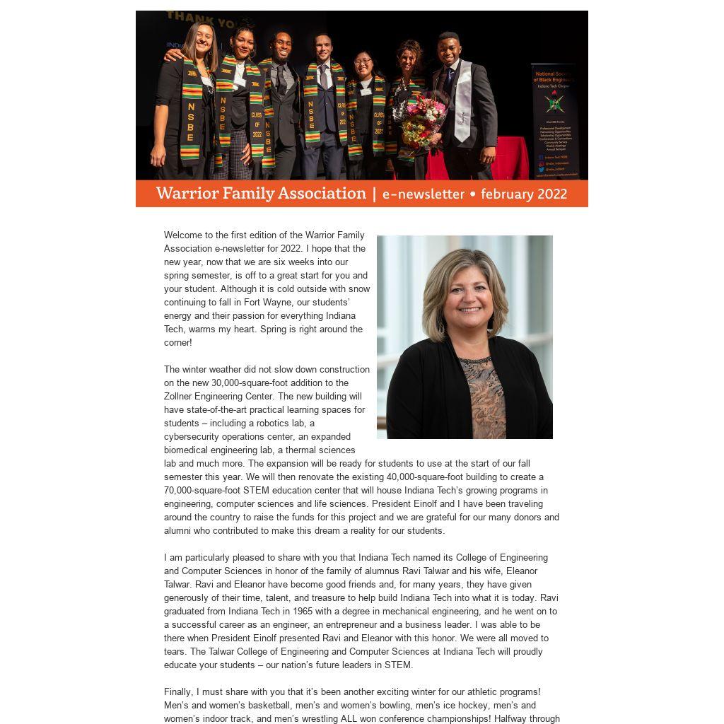 Welcome to the first edition of the Warrior Family Association e-newsletter for 2022. I hope that the new year, now that we are six weeks into our spring semester, is off to a great start for you and your student. Although it is cold outside with snow continuing to fall in Fort Wayne, our students’ energy and their passion for everything Indiana Tech, warms my heart. Spring is right around the corner!