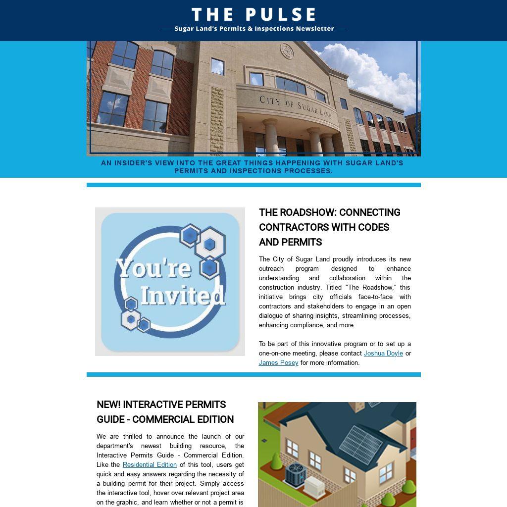 The City of Sugar Land proudly introduces its new outreach program designed to enhance understanding and collaboration within the construction industry. Titled "The Roadshow," this initiative brings city officials face-to-face with contractors and stakeholders to engage in an open dialogue of sharing insights, streamlining processes, enhancing compliance, and more.