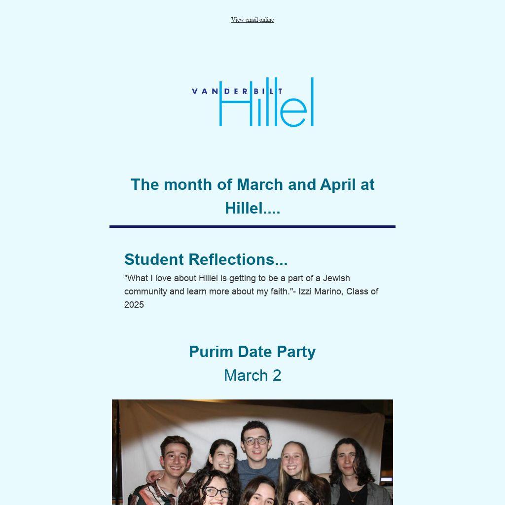 Vanderbilt Hillel students celebrated Passover with multiple seder options: Senior Seder, Murder Mystery Seder, Refugee Seder, and PJ Seder