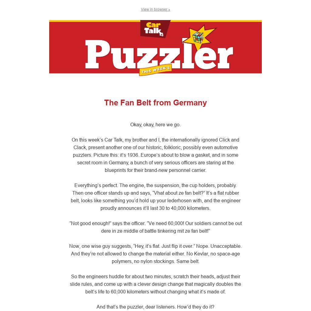 On this week’s Car Talk, my brother and I, the internationally ignored Click and Clack, present another one of our historic, folkloric, possibly even automotive puzzlers. Picture this: it’s 1936. Europe’s about to blow a gasket, and in some secret room in Germany, a bunch of very serious officers are staring at the blueprints for their brand-new personnel carrier.