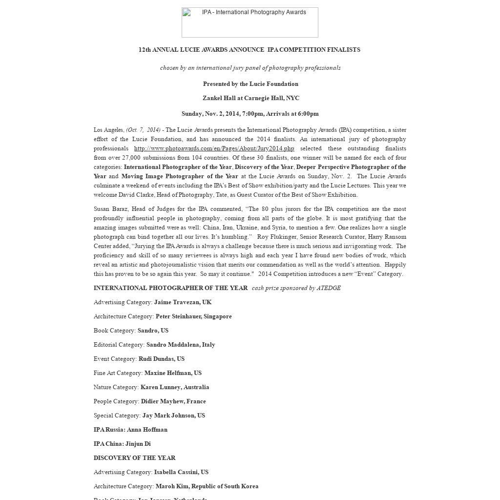 Los Angeles, (Oct. 7, 2014) - The Lucie Awards presents the International Photography Awards (IPA) competition, a sister effort of the Lucie Foundation, and has announced the 2014 finalists. An international jury of photography professionals http://www.photoawards.com/en/Pages/About/Jury2014.php selected these outstanding finalists from over 27,000 submissions from 104 countries. Of these 30 finalists, one winner will be named for each of four categories: International Photographer of the Year, Discovery of the Year, Deeper Perspective Photographer of the Year and Moving Image Photographer of the Year at the Lucie Awards on Sunday, Nov. 2. The Lucie Awards culminate a weekend of events including the IPA’s Best of Show exhibition/party and the Lucie Lectures. This year we welcome David Clarke, Head of Photography, Tate, as Guest Curator of the Best of Show Exhibition.
