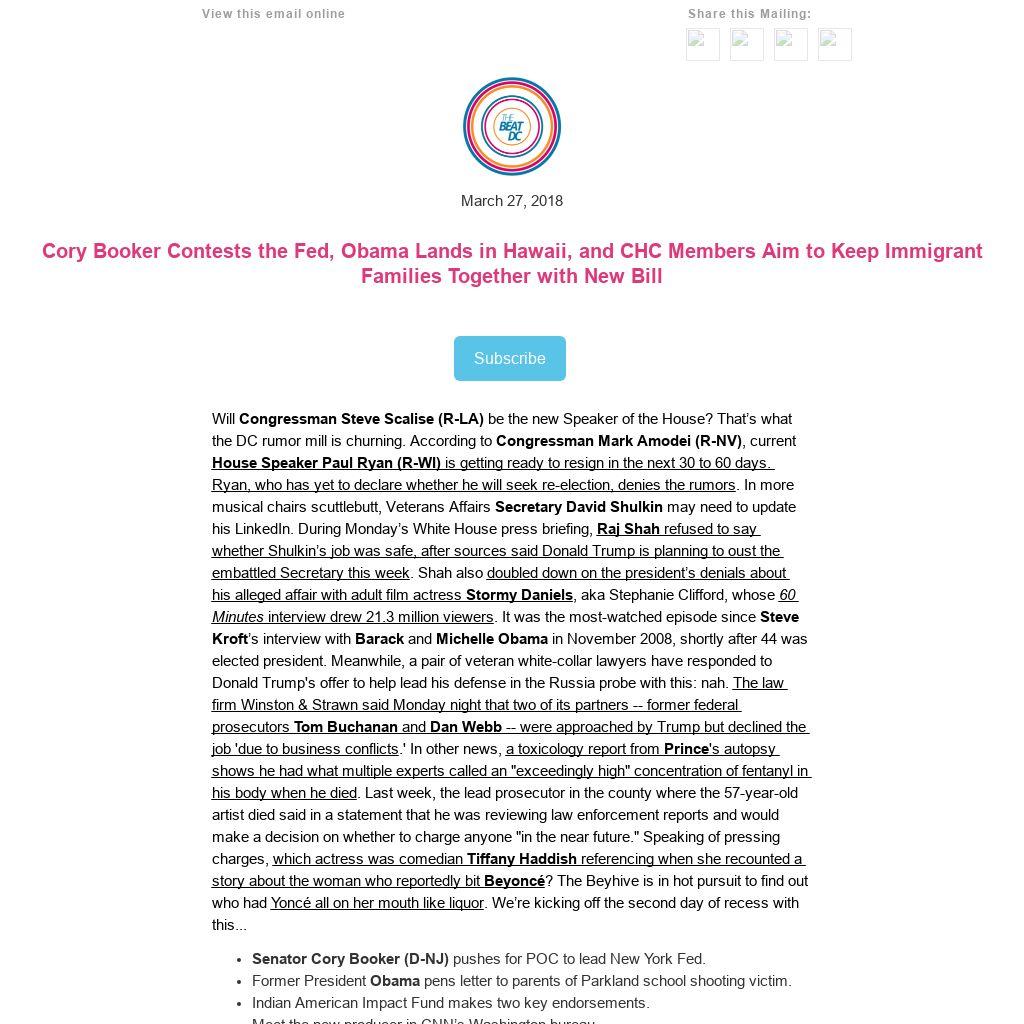 Will Congressman Steve Scalise (R-LA) be the new Speaker of the House? That’s what the DC rumor mill is churning. According to Congressman Mark Amodei (R-NV), current House Speaker Paul Ryan (R-WI) is getting ready to resign in the next 30 to 60 days. Ryan, who has yet to declare whether he will seek re-election, denies the rumors. In more musical chairs scuttlebutt, Veterans Affairs Secretary David Shulkin may need to update his LinkedIn. During Monday’s White House press briefing, Raj Shah refused to say whether Shulkin’s job was safe, after sources said Donald Trump is planning to oust the embattled Secretary this week. Shah also doubled down on the president’s denials about his alleged affair with adult film actress Stormy Daniels, aka Stephanie Clifford, whose 60 Minutes interview drew 21.3 million viewers. It was the most-watched episode since Steve Kroft’s interview with Barack and Michelle Obama in November 2008, shortly after 44 was elected president. Meanwhile, a pair of veteran white-collar lawyers have responded to Donald Trump's offer to help lead his defense in the Russia probe with this: nah. The law firm Winston & Strawn said Monday night that two of its partners -- former federal prosecutors Tom Buchanan and Dan Webb -- were approached by Trump but declined the job 'due to business conflicts.' In other news, a toxicology report from Prince's autopsy shows he had what multiple experts called an "exceedingly high" concentration of fentanyl in his body when he died. Last week, the lead prosecutor in the county where the 57-year-old artist died said in a statement that he was reviewing law enforcement reports and would make a decision on whether to charge anyone "in the near future." Speaking of pressing charges, which actress was comedian Tiffany Haddish referencing when she recounted a story about the woman who reportedly bit Beyoncé? The Beyhive is in hot pursuit to find out who had Yoncé all on her mouth like liquor. We’re kicking off the second day of recess with this...