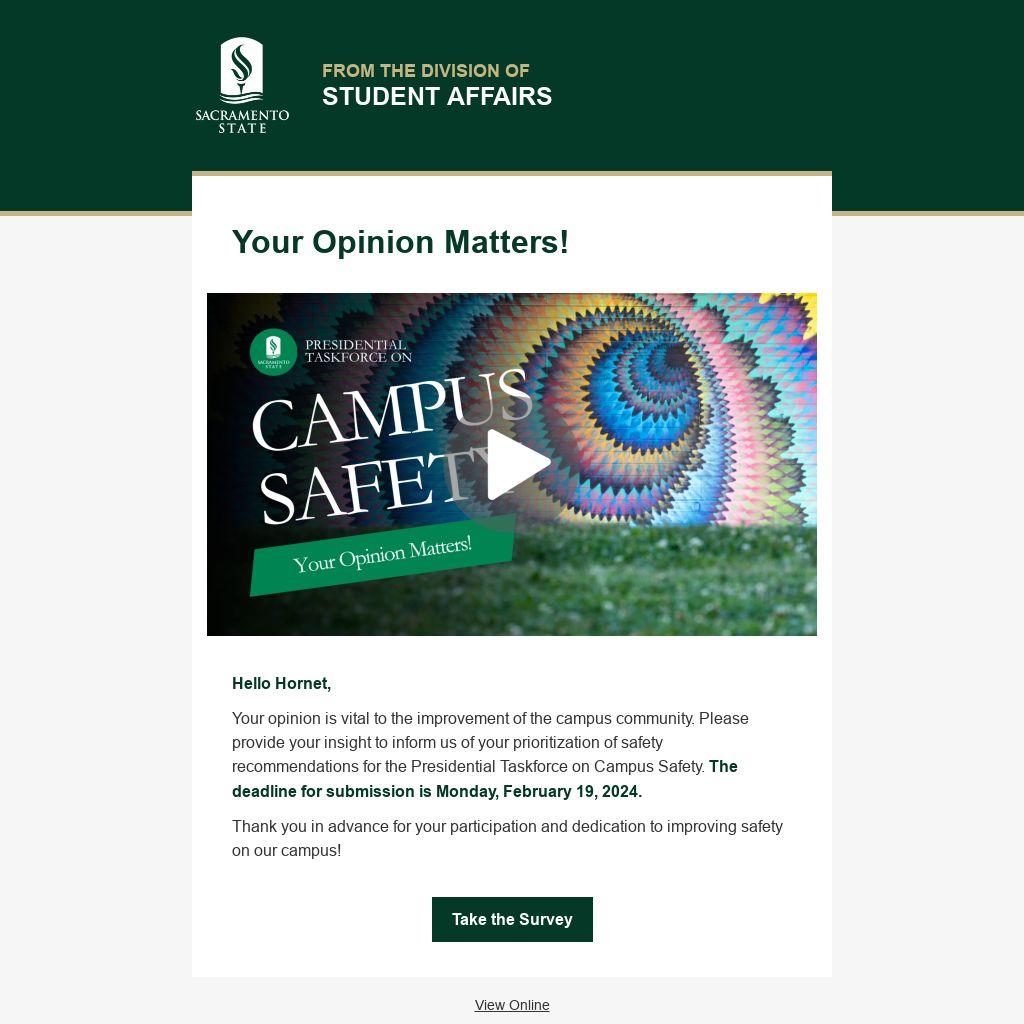Your opinion is vital to the improvement of the campus community. Please provide your insight to inform us of your prioritization of safety recommendations for the Presidential Taskforce on Campus Safety. The deadline for submission is Monday, February 19, 2024.