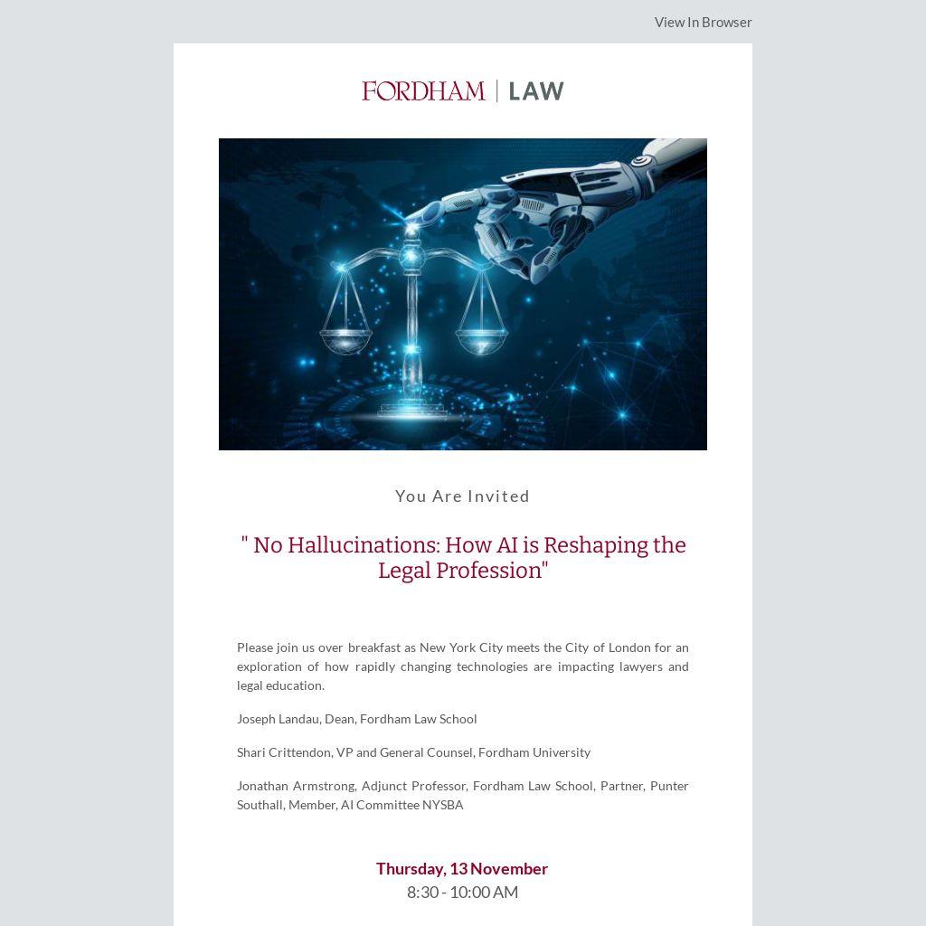 Please join us over breakfast as New York City meets the City of London for an exploration of how rapidly changing technologies are impacting lawyers and legal education.