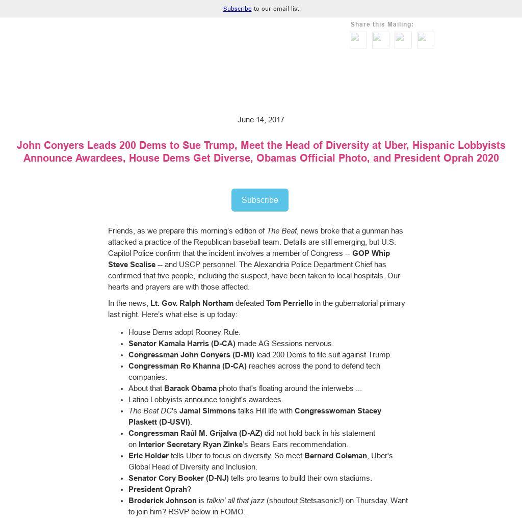 Friends, as we prepare this morning’s edition of The Beat, news broke that a gunman has attacked a practice of the Republican baseball team. Details are still emerging, but U.S. Capitol Police confirm that the incident involves a member of Congress -- GOP Whip Steve Scalise -- and USCP personnel. The Alexandria Police Department Chief has confirmed that five people, including the suspect, have been taken to local hospitals. Our hearts and prayers are with those affected.