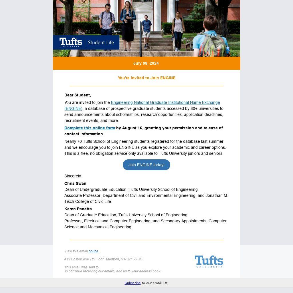 Nearly 70 Tufts School of Engineering students registered for the database last summer, and we encourage you to join ENGINE as you explore your academic and career options. This is a free, no obligation service only available to Tufts University juniors and seniors.