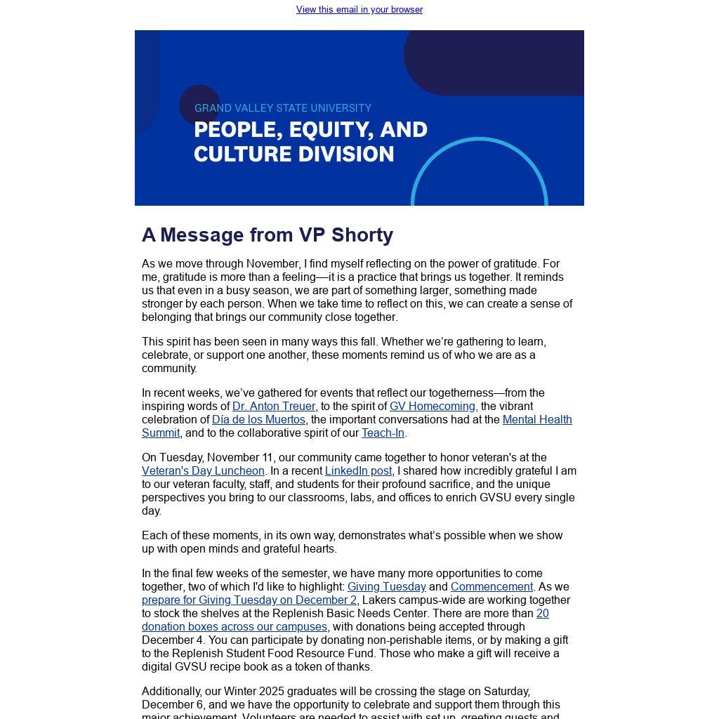 As we approach the season of thanks, I want to express my deep appreciation for the work you do each day. Thank you for your care for our students, your dedication to your colleagues, and your commitment to Grand Valley’s mission. Gratitude connects us, and I’m grateful to be on this journey with all of you.