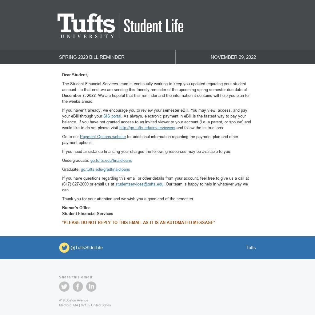 If you have questions regarding this email or other details from your account, feel free to give us a call at (617) 627-2000 or email us at studentservices@tufts.edu. Our team is happy to help in whatever way we can.