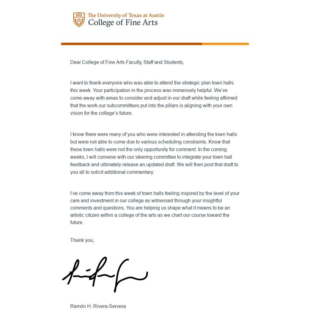 I’ve come away from this week of town halls feeling inspired by the level of your care and investment in our college as witnessed through your insightful comments and questions. You are helping us shape what it means to be an artistic citizen within a college of the arts as we chart our course toward the future.