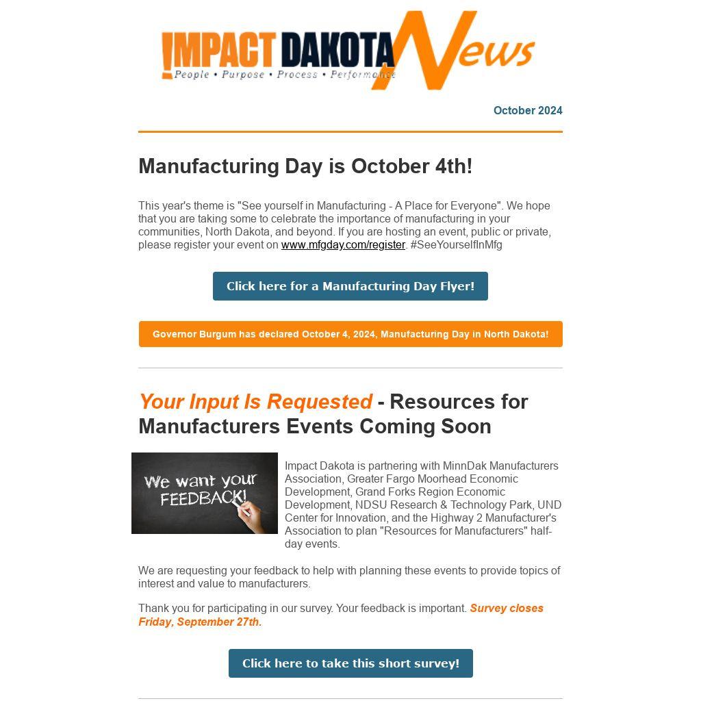 Impact Dakota is partnering with MinnDak Manufacturers Association, Greater Fargo Moorhead Economic Development, Grand Forks Region Economic Development, NDSU Research & Technology Park, UND Center for Innovation, and the Highway 2 Manufacturer's Association to plan "Resources for Manufacturers" half-day events.