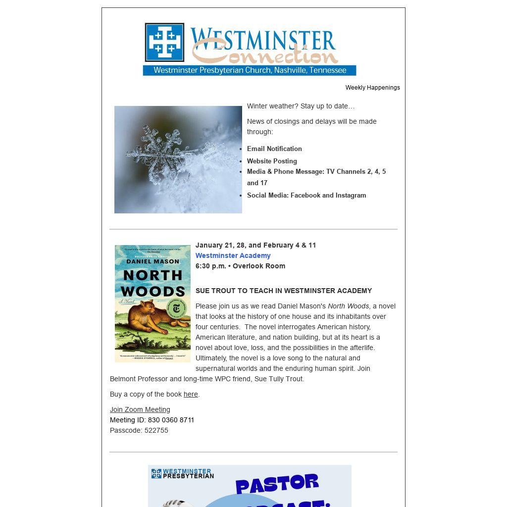 January 27 Westminster Book Group 9:30 a.m. | Fellowship 10:00 a.m. | Presentation Goodpasture Hall