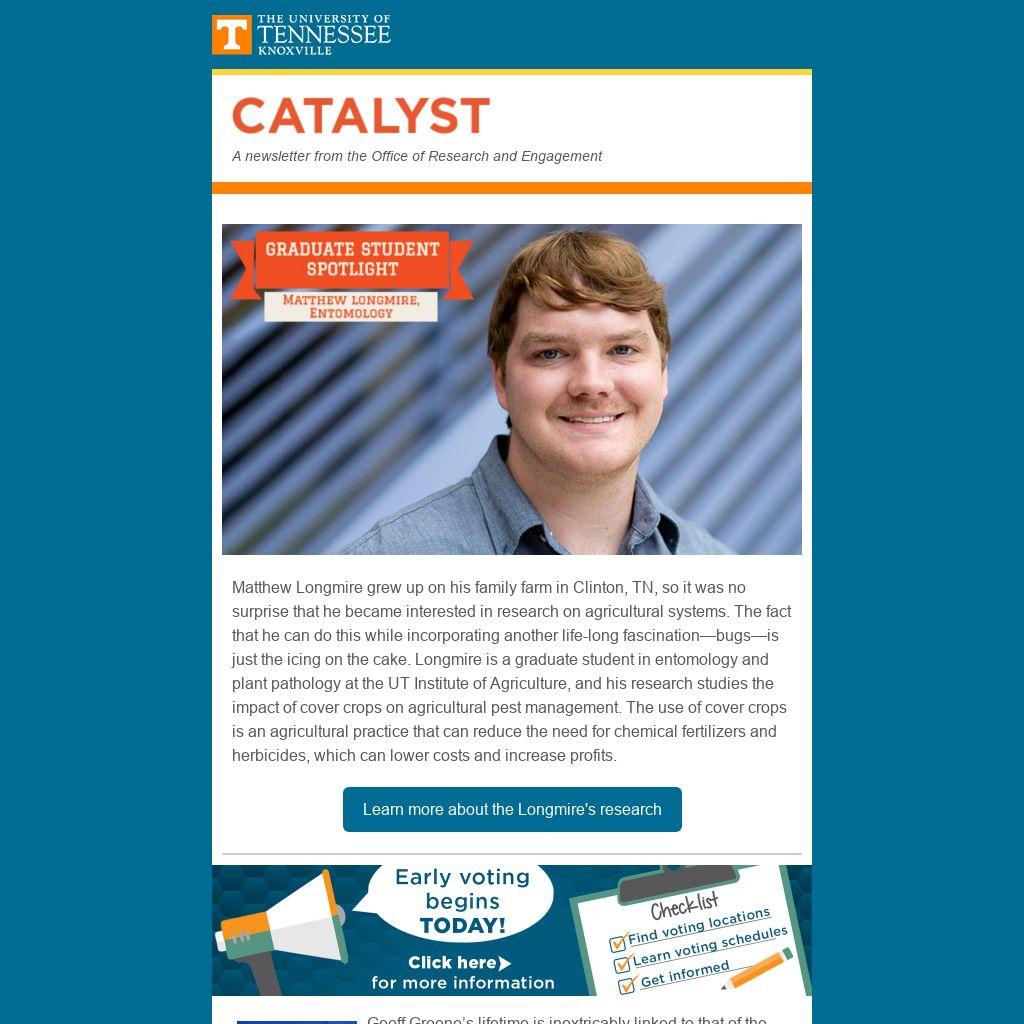 Matthew Longmire grew up on his family farm in Clinton, TN, so it was no surprise that he became interested in research on agricultural systems. The fact that he can do this while incorporating another life-long fascination—bugs—is just the icing on the cake. Longmire is a graduate student in entomology and plant pathology at the UT Institute of Agriculture, and his research studies the impact of cover crops on agricultural pest management. The use of cover crops is an agricultural practice that can reduce the need for chemical fertilizers and herbicides, which can lower costs and increase profits.