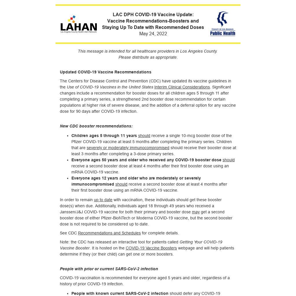 The CDC’s Advisory Committee on Immunization Practices (ACIP) met on 5/19/22 to further review the safety and effectiveness data, and made a strong recommendation that all eligible children aged 5-11 years old should receive a booster dose. In LA County, only 33% of children aged 5 through 11 years have completed their primary series, even though children aged 5-11 can get severely ill from COVID-19. There have been more than 4.8 million reported cases, over 15,000 cases that have been hospitalized, 3700 cases of MIS-C, and 180 deaths due to COVID-19 in this age group in the US to date (See ACIP slides). Per Kaiser Family Foundation, physicians are the most trusted source of information on the COVID-19 vaccine. For these reasons, we urge providers to do the following:
