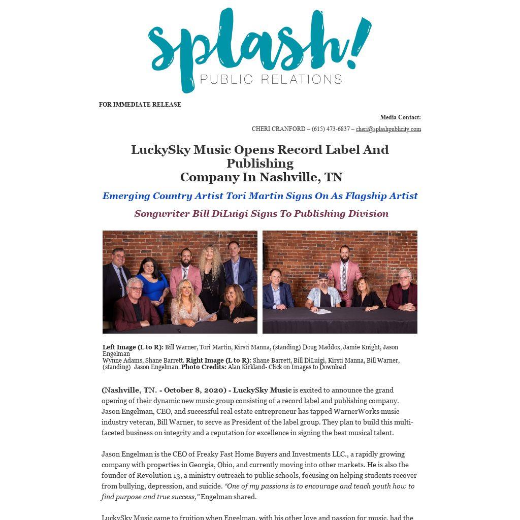 (Nashville, TN. - October 8, 2020) - LuckySky Music is excited to announce the grand opening of their dynamic new music group consisting of a record label and publishing company. Jason Engelman, CEO, and successful real estate entrepreneur has tapped WarnerWorks music industry veteran, Bill Warner, to serve as President of the label group. They plan to build this multi-faceted business on integrity and a reputation for excellence in signing the best musical talent.