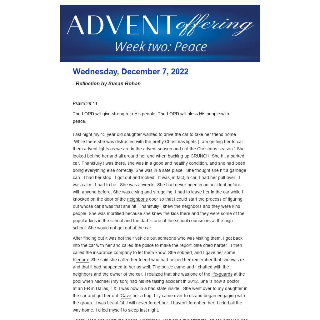 Last night my 15 year old daughter wanted to drive the car to take her friend home. While there she was distracted with the pretty Christmas lights (I am getting her to call them advent lights as we are in the advent season and not the Christmas season.) She looked behind her and all around her and when backing up CRUNCH! She hit a parked car. Thankfully I was there, she was in a good and healthy condition, and she had been doing everything else correctly. She was in a safe place. She thought she hit a garbage can. I had her stop. I got out and looked. It was, in fact, a car. I had her pull-over. I was calm. I had to be. She was a wreck. She had never been in an accident before, with anyone before. She was crying and struggling. I had to leave her in the car while I knocked on the door of the neighbor's door so that I could start the process of figuring out whose car it was that she hit. Thankfully I knew the neighbors and they were kind people. She was mortified because she knew the kids there and they were some of the popular kids in the school and the dad is one of the school counselors at the high school. She would not get out of the car.