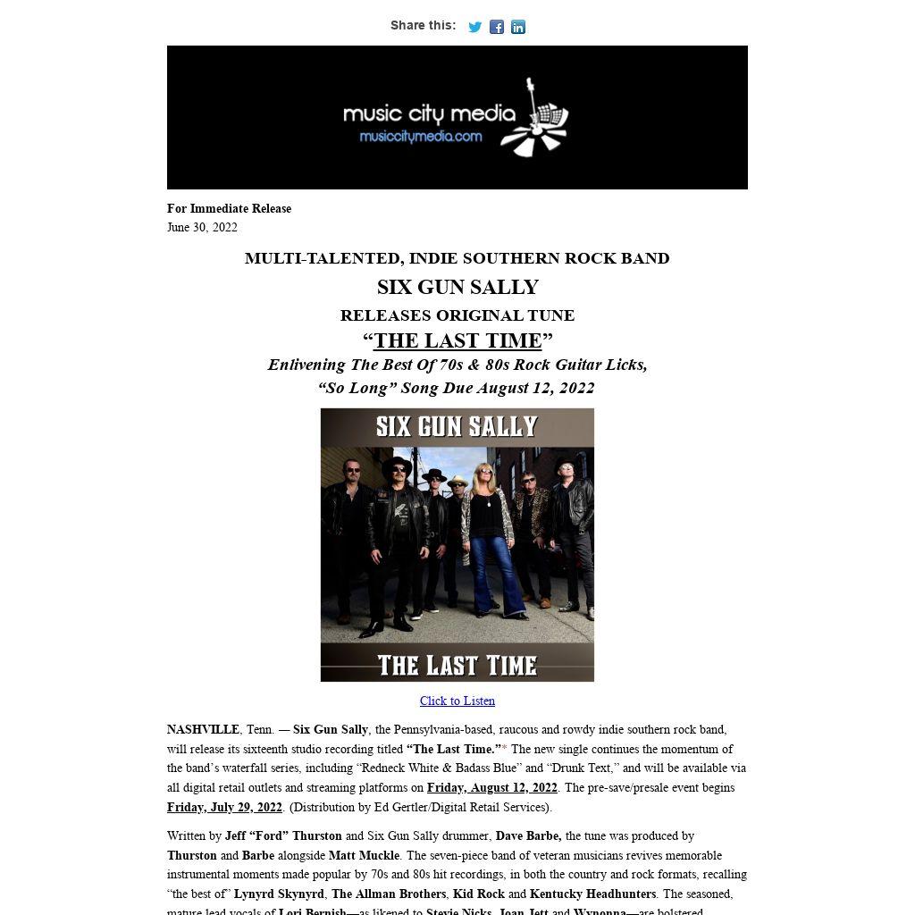 NASHVILLE, Tenn. — Six Gun Sally, the Pennsylvania-based, raucous and rowdy indie southern rock band, will release its sixteenth studio recording titled “The Last Time.”* The new single continues the momentum of the band’s waterfall series, including “Redneck White & Badass Blue” and “Drunk Text,” and will be available via all digital retail outlets and streaming platforms on Friday, August 12, 2022. The pre-save/presale event begins Friday, July 29, 2022. (Distribution by Ed Gertler/Digital Retail Services).