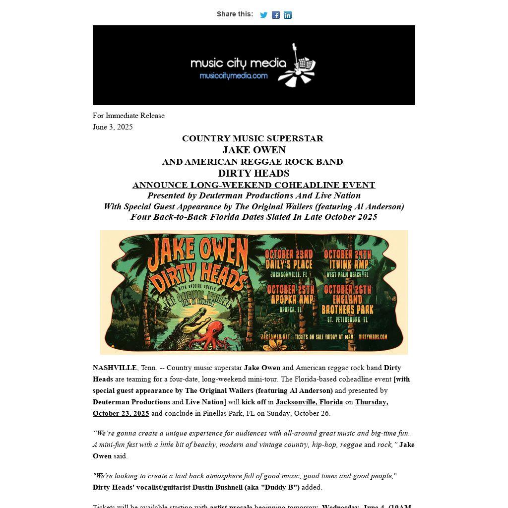 NASHVILLE, Tenn. -- Country music superstar Jake Owen and American reggae rock band Dirty Heads are teaming for a four-date, long-weekend mini-tour. The Florida-based coheadline event [with special guest appearance by The Original Wailers (featuring Al Anderson) and presented by