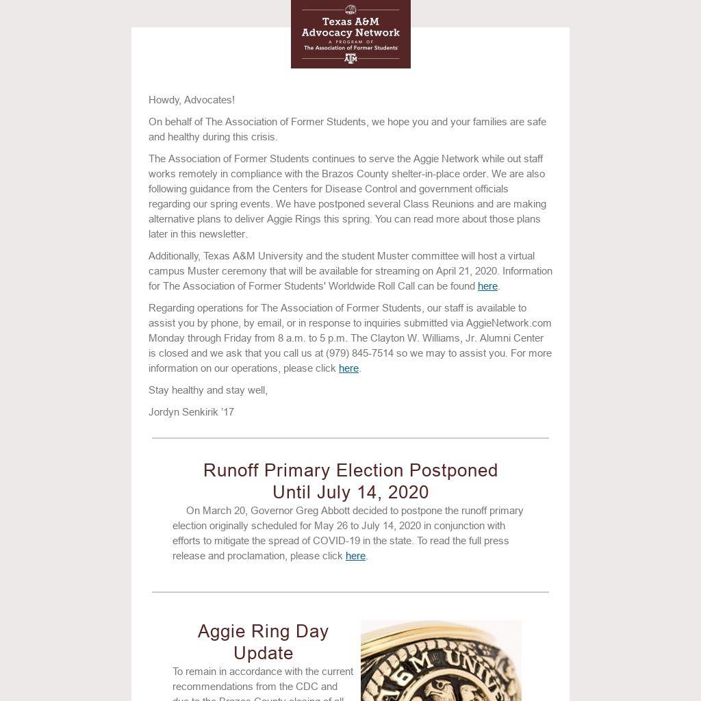 The Association of Former Students continues to serve the Aggie Network while out staff works remotely in compliance with the Brazos County shelter-in-place order. We are also following guidance from the Centers for Disease Control and government officials regarding our spring events. We have postponed several Class Reunions and are making alternative plans to deliver Aggie Rings this spring. You can read more about those plans later in this newsletter.