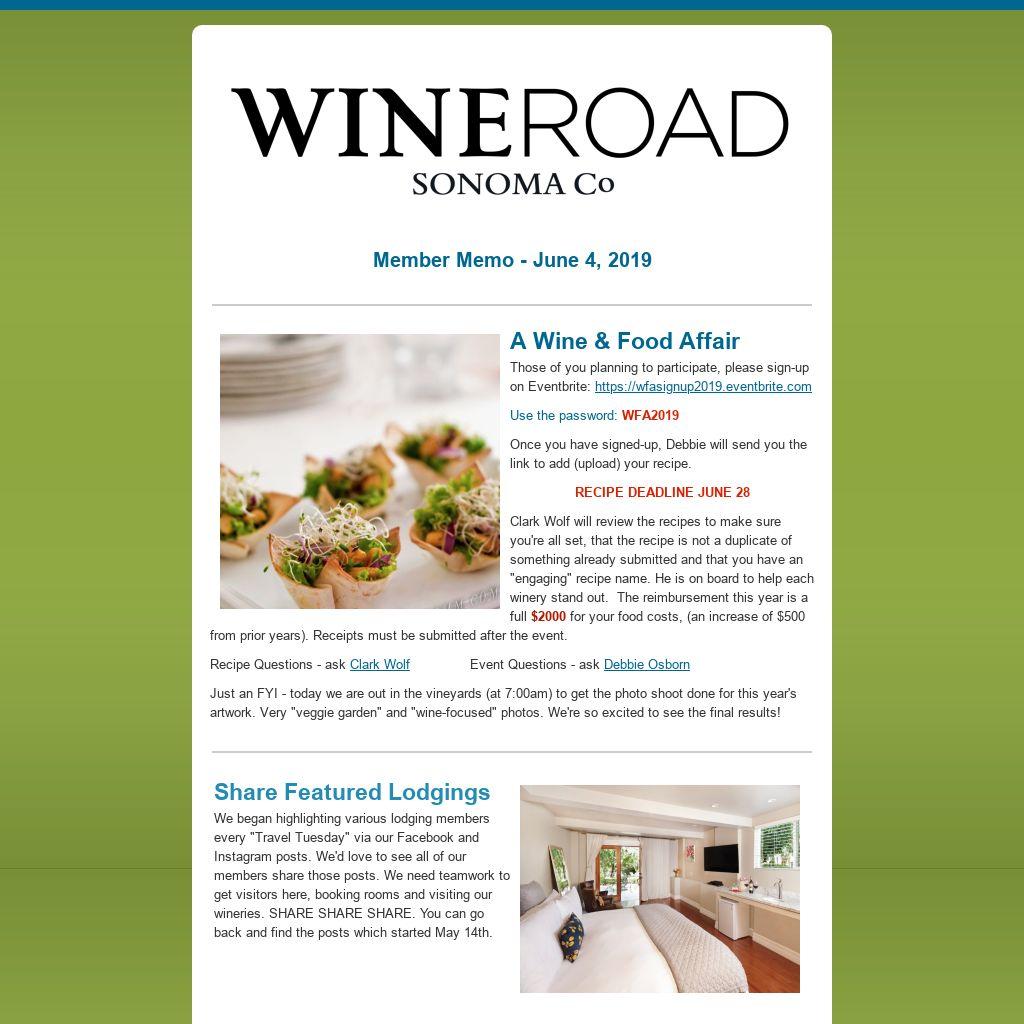 Clark Wolf will review the recipes to make sure you're all set, that the recipe is not a duplicate of something already submitted and that you have an "engaging" recipe name. He is on board to help each winery stand out. The reimbursement this year is a full $2000 for your food costs, (an increase of $500 from prior years). Receipts must be submitted after the event.