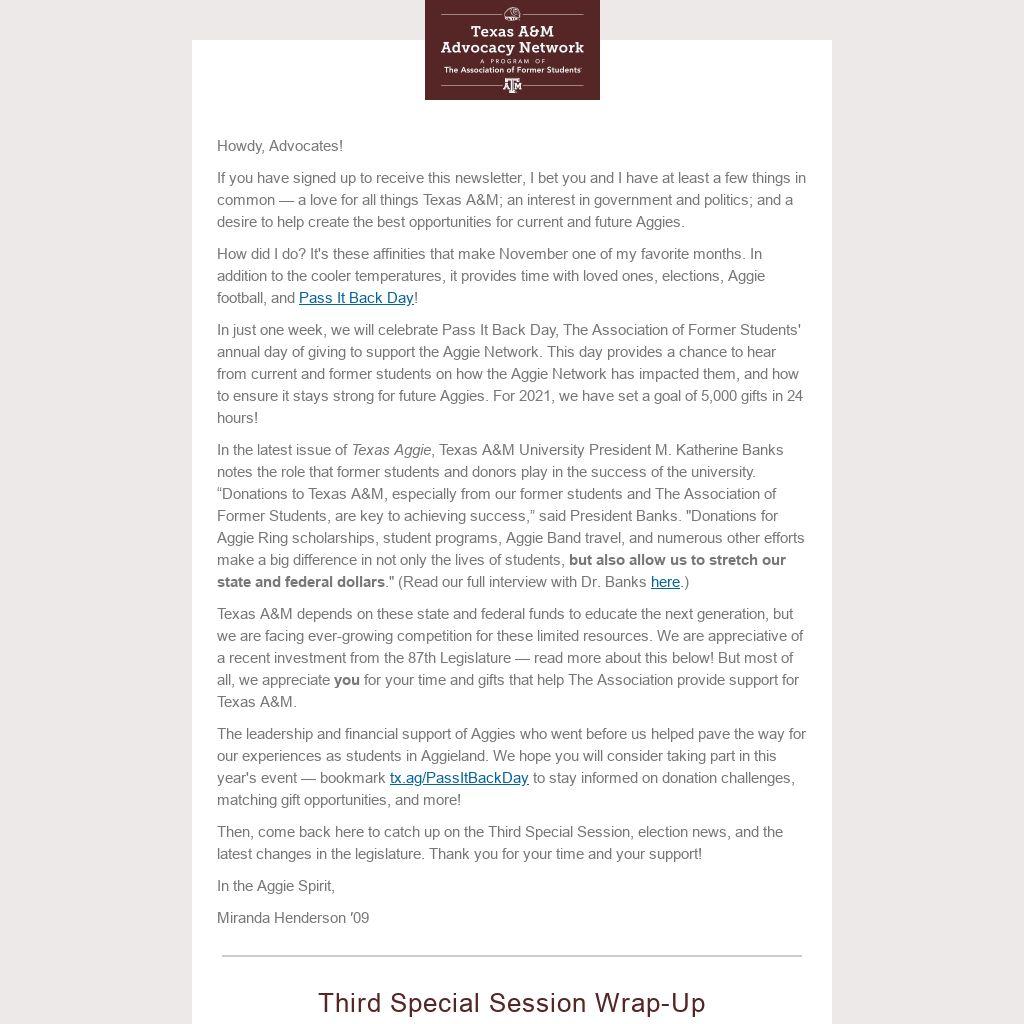 If you have signed up to receive this newsletter, I bet you and I have at least a few things in common — a love for all things Texas A&M; an interest in government and politics; and a desire to help create the best opportunities for current and future Aggies.