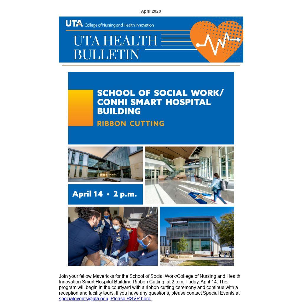 Join your fellow Mavericks for the School of Social Work/College of Nursing and Health Innovation Smart Hospital Building Ribbon Cutting, at 2 p.m. Friday, April 14. The program will begin in the courtyard with a ribbon-cutting ceremony and continue with a reception and facility tours. If you have any questions, please contact Special Events at specialevents@uta.edu. Please RSVP here.
