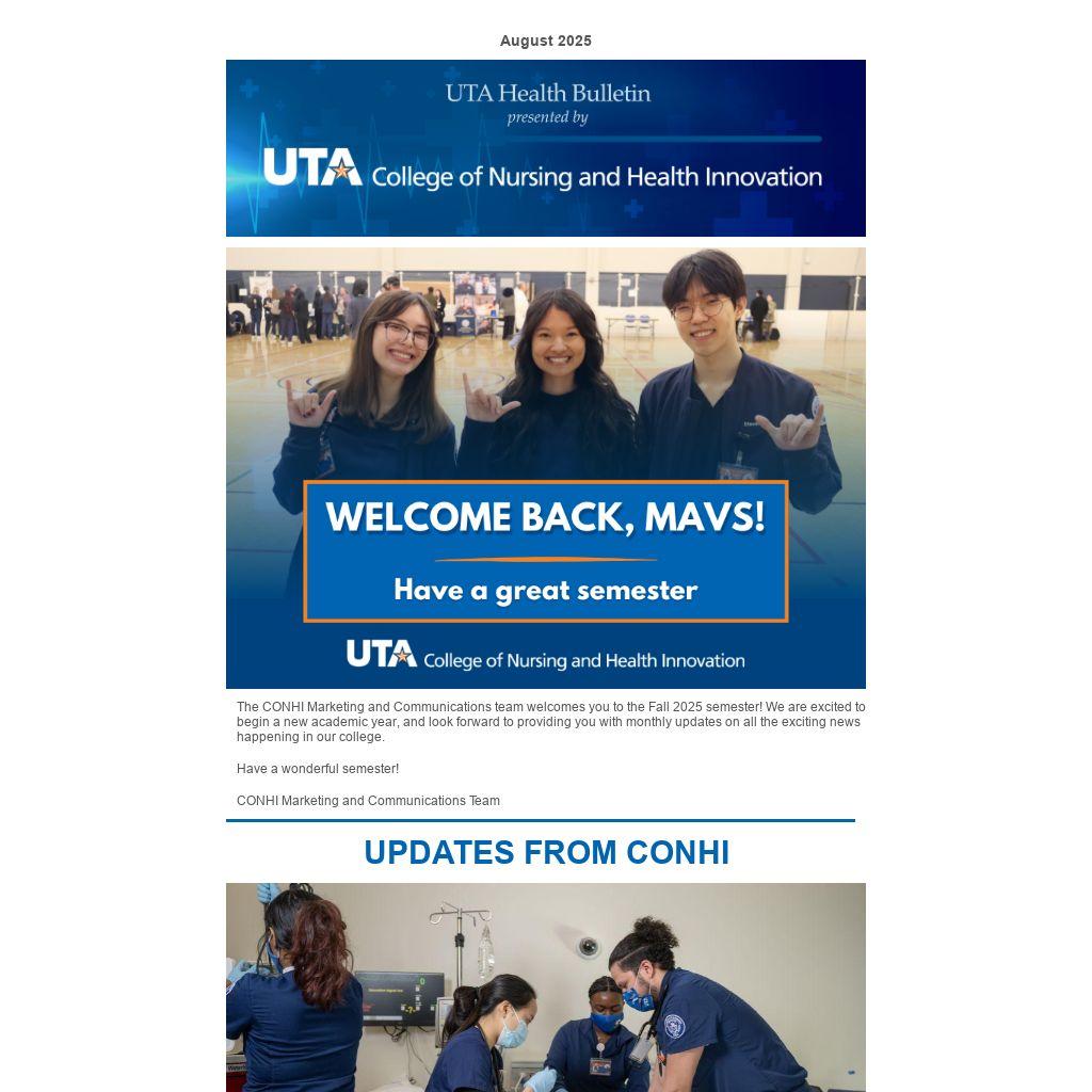 The CONHI Marketing and Communications team welcomes you to the Fall 2025 semester! We are excited to begin a new academic year, and look forward to providing you with monthly updates on all the exciting news happening in our college.
