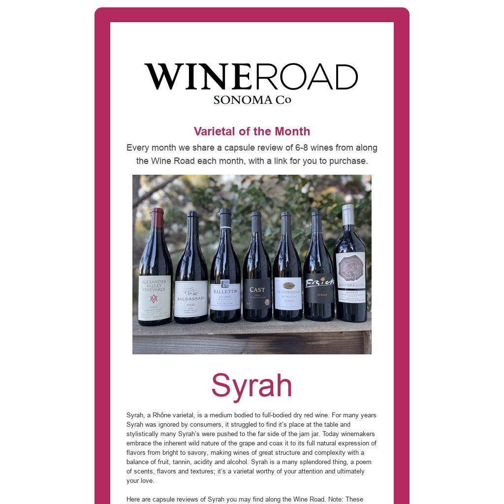 | Varietal of the Month Every month we share a capsule review of 6-8 wines from along the Wine Road each month, with a link for you to purchase.