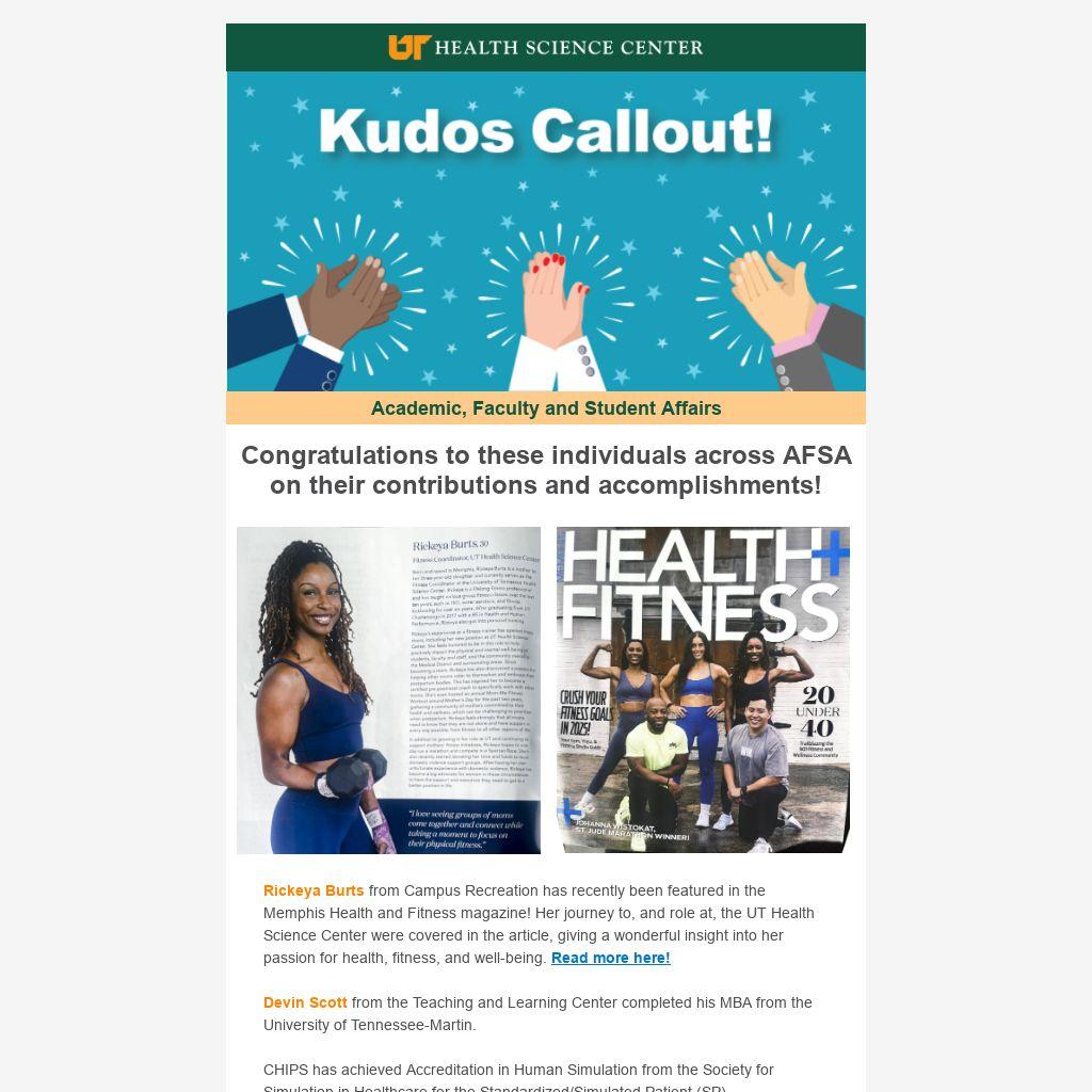 Rickeya Burts from Campus Recreation has recently been featured in the Memphis Health and Fitness magazine! Her journey to, and role at, the UT Health Science Center were covered in the article, giving a wonderful insight into her passion for health, fitness, and well-being. Read more here!