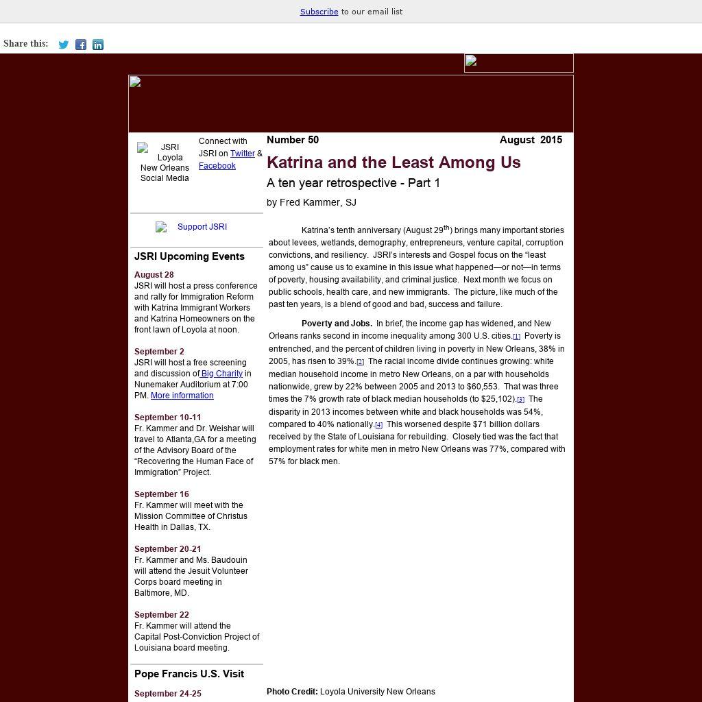 Katrina’s tenth anniversary (August 29th) brings many important stories about levees, wetlands, demography, entrepreneurs, venture capital, corruption convictions, and resiliency. JSRI’s interests and Gospel focus on the “least among us” cause us to examine in this issue what happened—or not—in terms of poverty, housing availability, and criminal justice. Next month we focus on public schools, health care, and new immigrants. The picture, like much of the past ten years, is a blend of good and bad, success and failure.