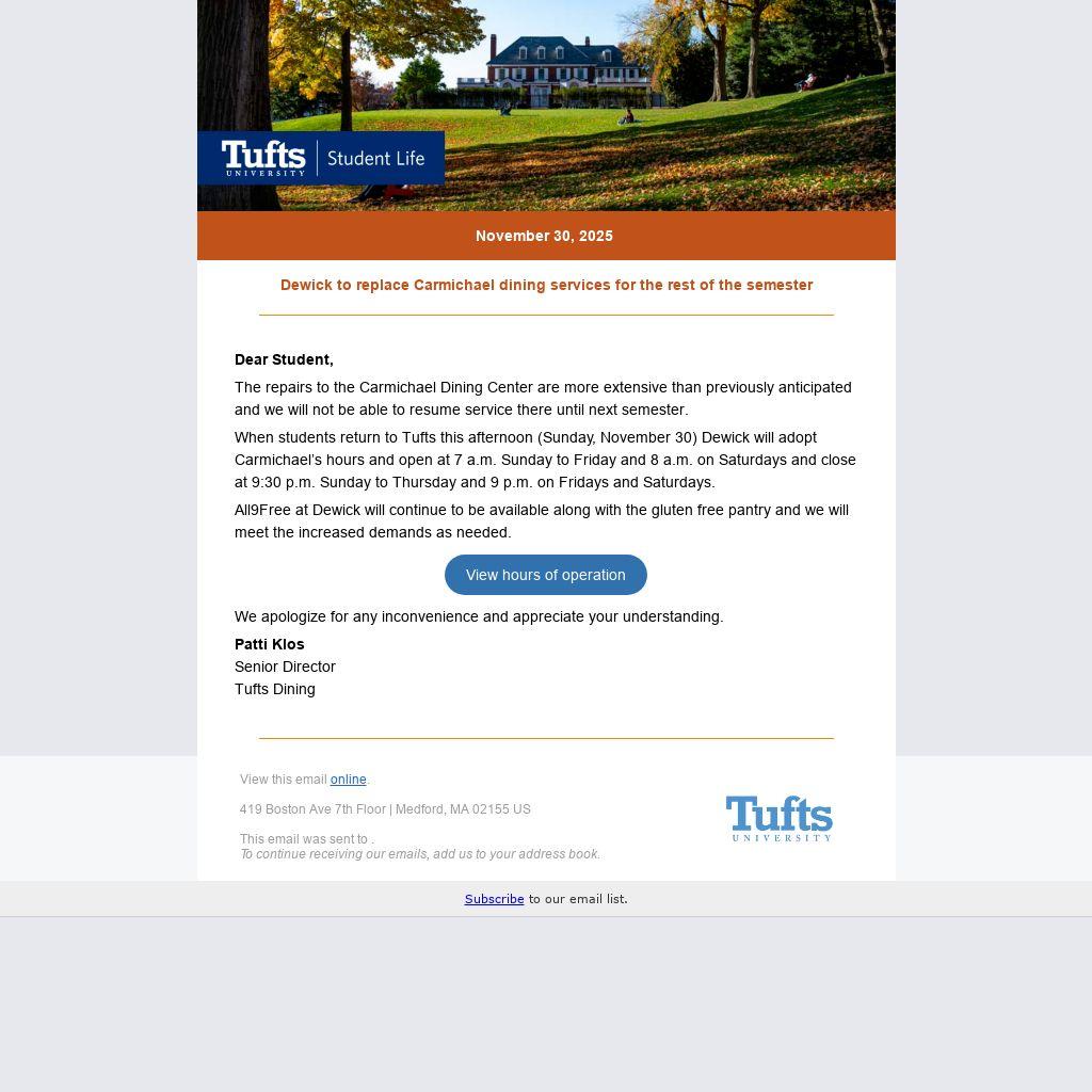 When students return to Tufts this afternoon (Sunday, November 30) Dewick will adopt Carmichael’s hours and open at 7 a.m. Sunday to Friday and 8 a.m. on Saturdays and close at 9:30 p.m. Sunday to Thursday and 9 p.m. on Fridays and Saturdays.