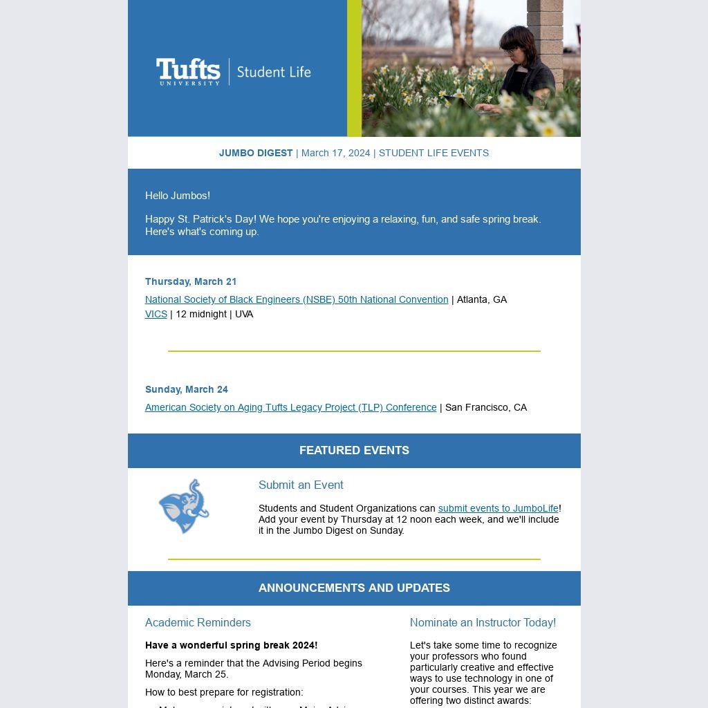 Students and Student Organizations can submit events to JumboLife! Add your event by Thursday at 12 noon each week, and we'll include it in the Jumbo Digest on Sunday.