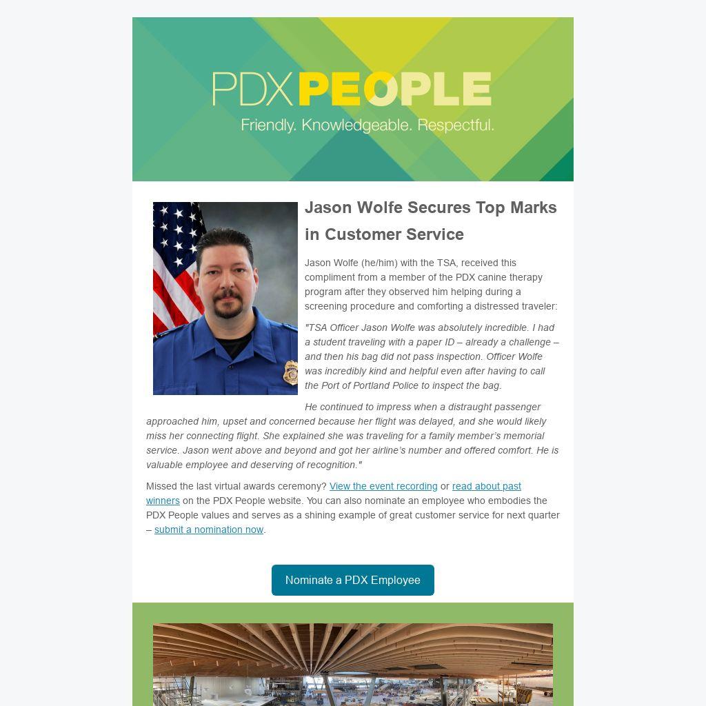Jason Wolfe (he/him) with the TSA, received this compliment from a member of the PDX canine therapy program after they observed him helping during a screening procedure and comforting a distressed traveler: