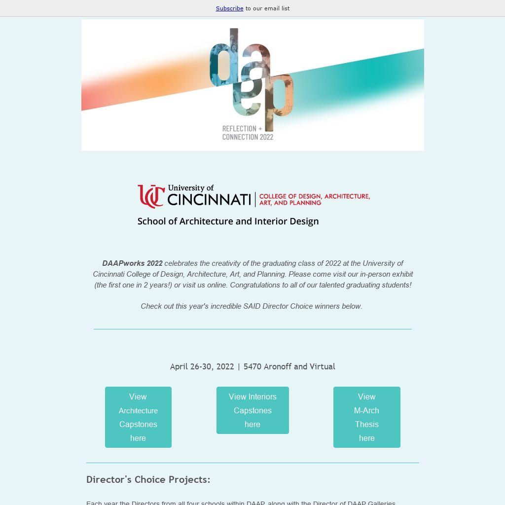 DAAPworks 2022 celebrates the creativity of the graduating class of 2022 at the University of Cincinnati College of Design, Architecture, Art, and Planning. Please come visit our in-person exhibit (the first one in 2 years!) or visit us online. Congratulations to all of our talented graduating students!