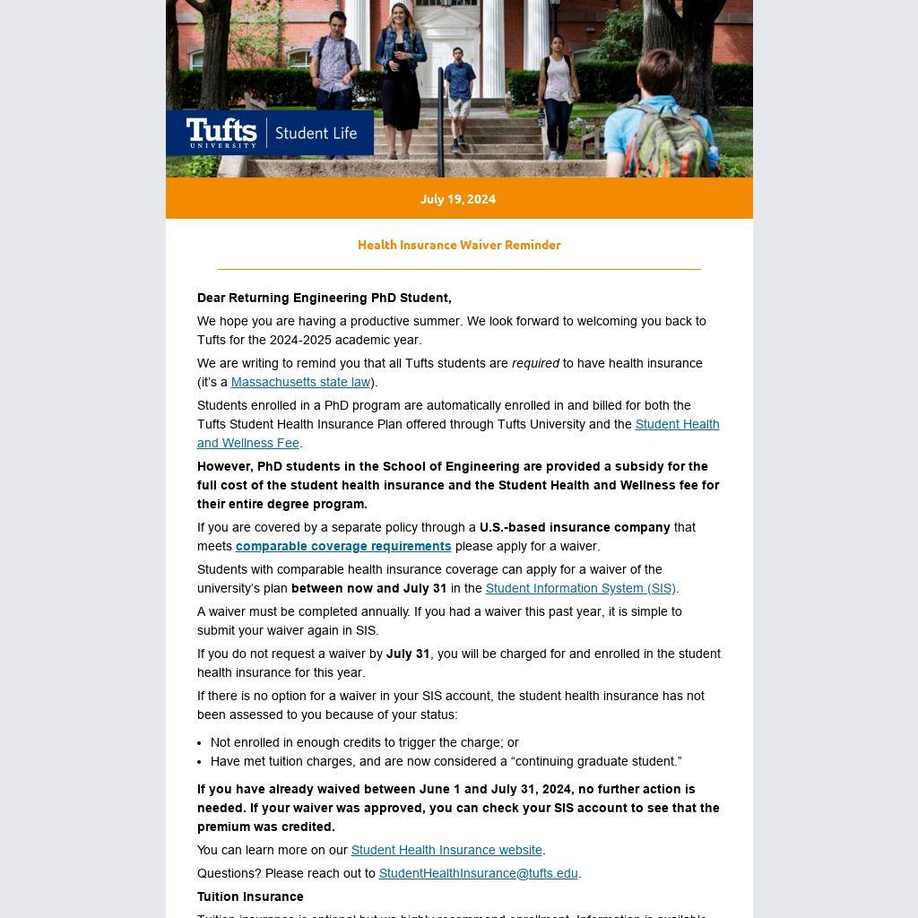 Students enrolled in a PhD program are automatically enrolled in and billed for both the Tufts Student Health Insurance Plan offered through Tufts University and the Student Health and Wellness Fee.