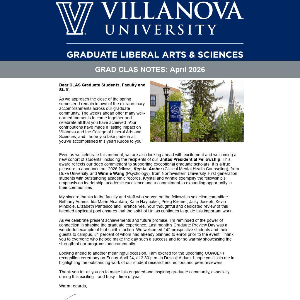 As we approach the close of the spring semester, I remain in awe of the extraordinary accomplishments across our graduate community. The weeks ahead offer many well-earned moments to come together and celebrate all that you have achieved. Your contributions have made a lasting impact on Villanova and the College of Liberal Arts and Sciences, and I hope you take pride in all you’ve accomplished this year! Kudos to you!