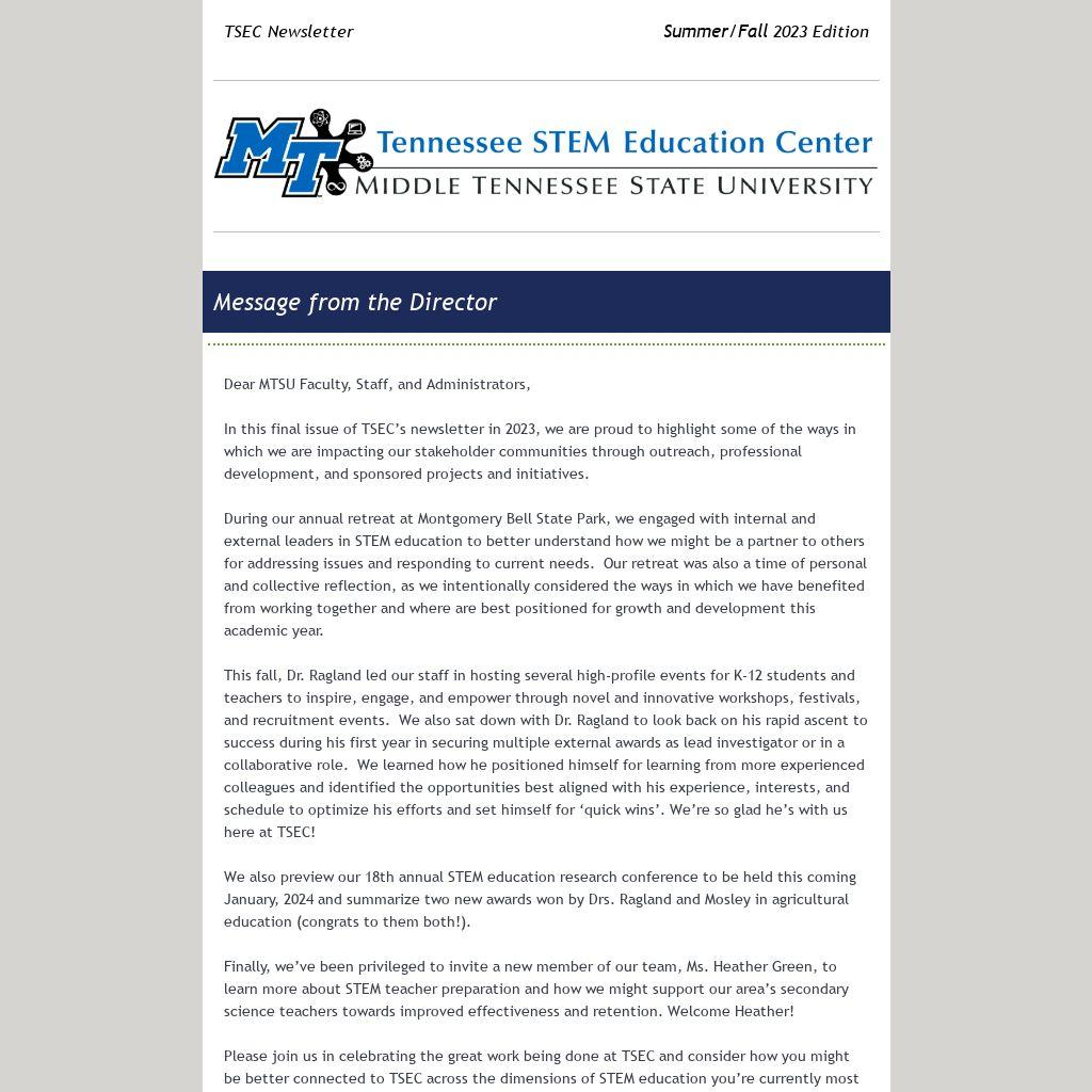 In this final issue of TSEC’s newsletter in 2023, we are proud to highlight some of the ways in which we are impacting our stakeholder communities through outreach, professional development, and sponsored projects and initiatives.