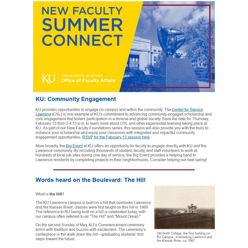 KU provides opportunities to engage on campus and within the community. The Center for Service Learning (CSL) is one example of KU's commitment to advancing community-engaged scholarship and civic engagement that fosters participation in a diverse and global society. Save the date for Thursday, February 13 from 3-4:15 p.m. to learn more about CSL and other experiential learning taking place at KU. As part of our New Faculty Foundations series, this session will also provide you with the tools to enhance your scholarship and equip your classroom with integrated and impactful community engagement opportunities. RSVP for the February 13 session here.