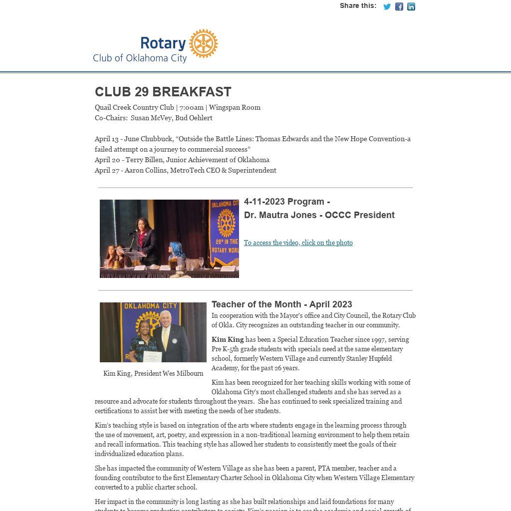 In cooperation with the Mayor's office and City Council, the Rotary Club of Okla. City recognizes an outstanding teacher in our community.