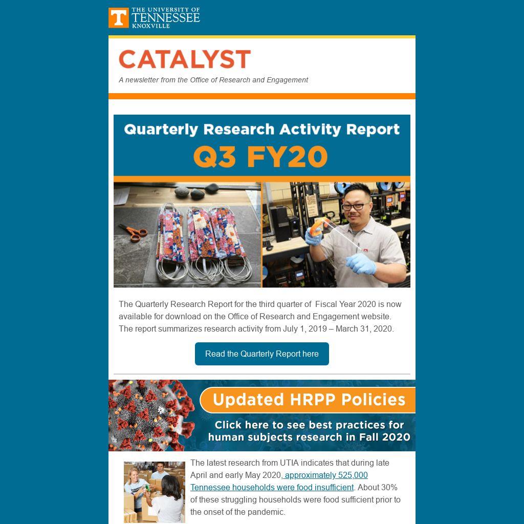 The Quarterly Research Report for the third quarter of Fiscal Year 2020 is now available for download on the Office of Research and Engagement website. The report summarizes research activity from July 1, 2019 – March 31, 2020.
