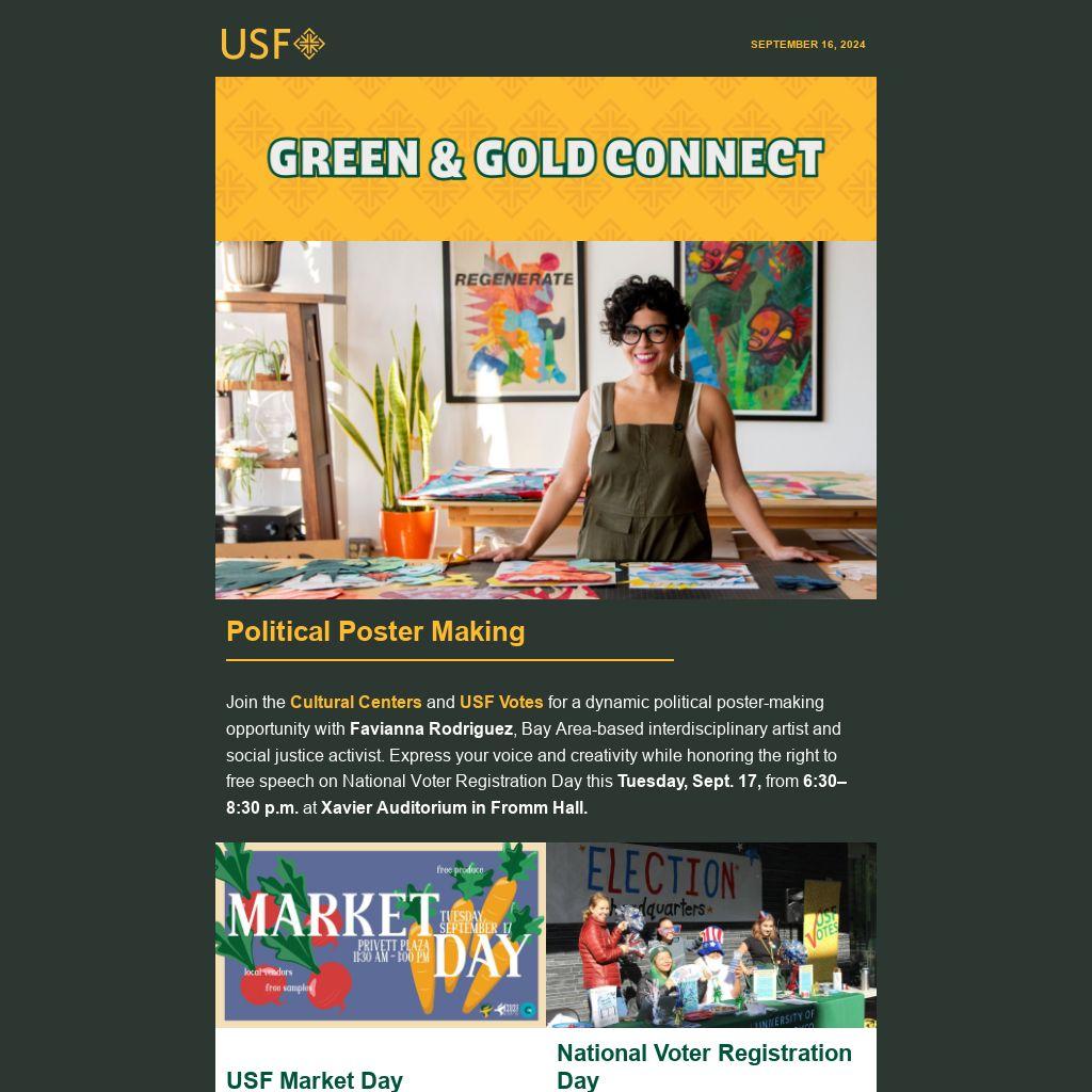 Join the Cultural Centers and USF Votes for a dynamic political poster-making opportunity with Favianna Rodriguez, Bay Area-based interdisciplinary artist and social justice activist. Express your voice and creativity while honoring the right to free speech on National Voter Registration Day this Tuesday, Sept. 17, from 6:30–8:30 p.m. at Xavier Auditorium in Fromm Hall.