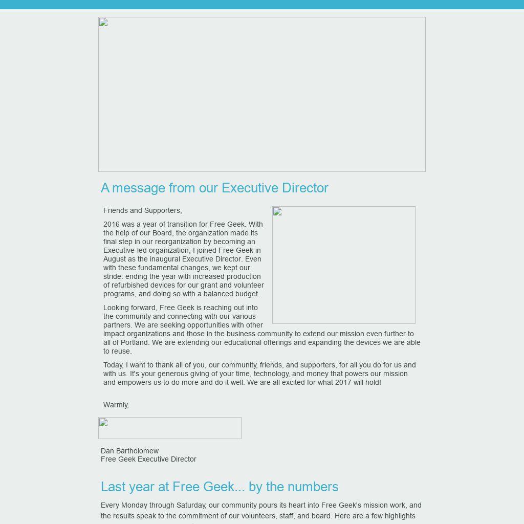 2016 was a year of transition for Free Geek. With the help of our Board, the organization made its final step in our reorganization by becoming an Executive-led organization; I joined Free Geek in August as the inaugural Executive Director. Even with these fundamental changes, we kept our stride: ending the year with increased production of refurbished devices for our grant and volunteer programs, and doing so with a balanced budget.